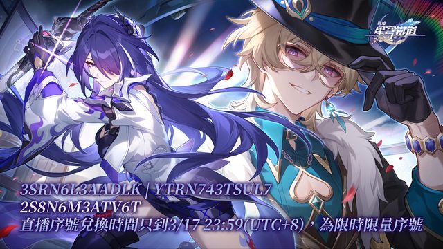 星瓊序號兌換時限到3/17 23:59(UTC+8),記得趕快換喔~~