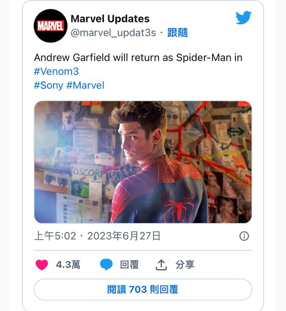→ holyseraph : 或是出現平行宇宙的蜘蛛關? 由艾瑪史東飾演 06/30 10:16