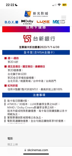 推 kiminoegao : 不過新光app不錯 每個銀行優惠票價都會寫 不像威秀 06/30 22:26