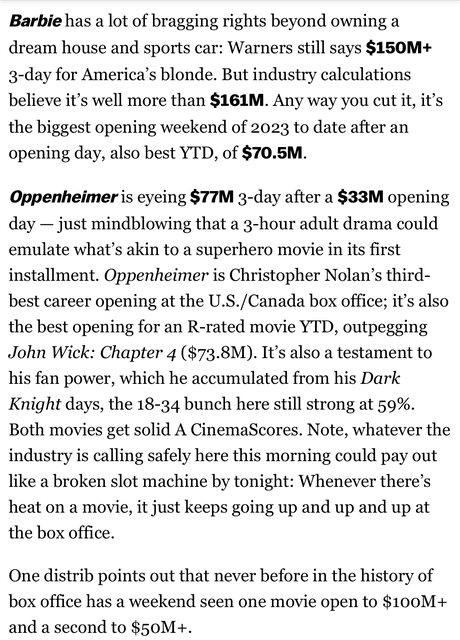 推 holyseraph : 奧本海默首週末三天從77M上修到80M 芭比週六跌36% 07/23 13:52