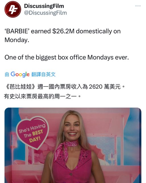 推 chyx741021 : 芭比的週一票房是今年最高的,比小美人魚在陣亡將 07/26 00:50