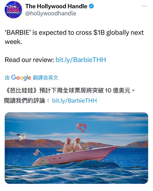 推 Grrr : 芭比一定破十億,十五億也有可能… 07/29 13:44