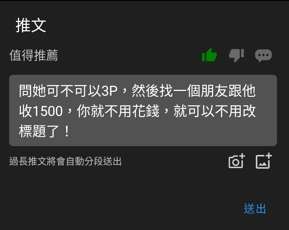 CTTSAI: 衝啊 現在X都私約 少了黑道和馬伕 便宜很多 11/12 08:43