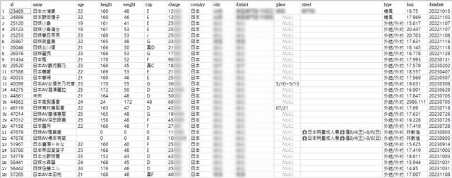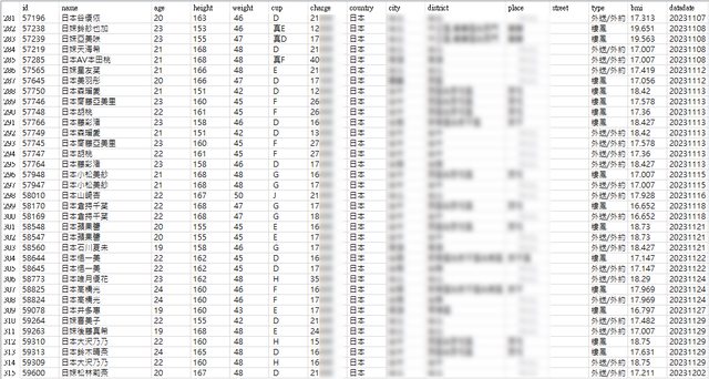 2022年6月底我受到榮哲老司機啟發, 寫了一個程式每天自動收集報班資料, 到 2023年11月為止,已經收集 84萬筆資料。 當然,這些資料僅是台灣性交易產業部分情況, 無法代表全貌。 期間我也親身進行田野屌查, 對台灣當前性交易產業有了洨洨的認知, 這邊說說我粗略的觀察心得, 僅供學術討論,請勿來信詢問交易管道。 現今台灣是一個性交易非常便利的環境。 性交易幾乎是大部分人都負擔得起的消費。 從低價的外籍樓鳳,到高價的日本 AV女優外送,一硬俱全。 521天當中,總計出現過 43,698位妹子。 從城市分布來看,台北+新北有 13,932人。 台中是第二名,有 5,372人。 中壢第三,台南第四、桃園第五、新竹第六。 如果中壢+桃園,那會變成第二名。 從國籍來看,泰國 10,125 排第一。 第二是馬來西亞 9,365。 第三是台灣妹子,有 8,547人。 第四是越南 6,578。 第五是日本,但人數大幅下降到 965人, 由此可知,外籍主要是泰國、馬來西亞、越南。 https://i.imgur.com/JnW2tR4.png