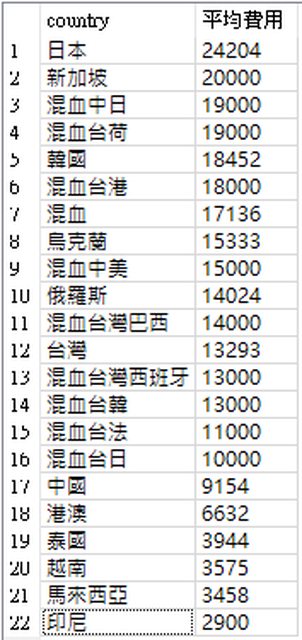 再來談談收費程度。 樓鳳/定點 是的,還是有日妹在樓鳳蹲點,不過收費平均要 13.8K。 韓國、東歐、俄烏,都是價位較高的族群。 那麼台灣妹子呢?平均樓鳳收費是 3.8K,還略低於中國、港澳妹子。 從業主力國籍 越南 2.9K、泰國、馬來西亞 2.8K。 排行最後是台灣新住民,只有 2.5K,是弱勢族群。 https://i.imgur.com/Zprv5Kp.png