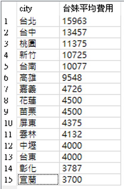 最後來看看各城市,台妹平均外送費用。 第一名 台北+新北 16K,台北網紅、小模多,這個收費可以理解。 第二名 台中 13.4K,娛樂之都的妹子品質,這個收費應該是合理。 桃園、新竹、台南,平均都要 11K、10K,高雄略低 9.5K。 但中壢的台妹外送平均費用竟然掉到 4K,這應該直接搭車北送賺價差吧? https://i.imgur.com/ZzaQ63J.png