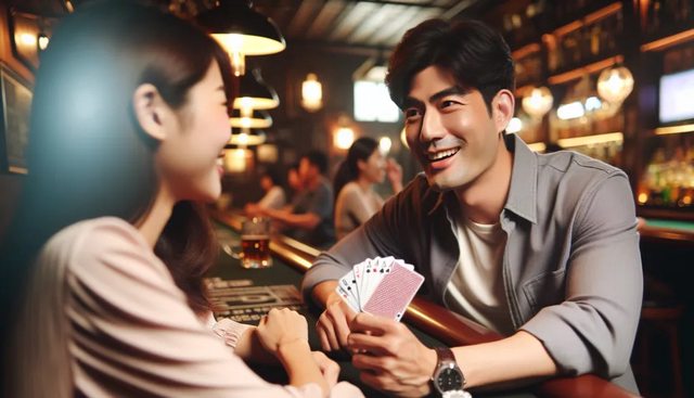 吧燈光昏暗、聲音嘈雜,玩撲克牌時施展表演魔術的手部技法,以輸的人必須喝酒為由,