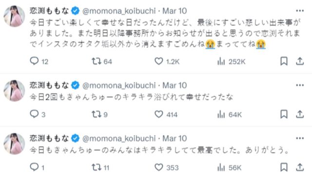 戀渕桃奈10日曾發文「今天原本是很開心很幸福的一天,最後卻發生了傷心的事,接著明