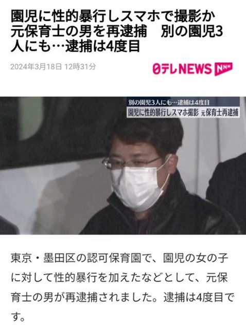 日本東京都墨田區的托兒所(保育園)爆發一起極為離譜的性侵案件,嫌犯為擔任保育員