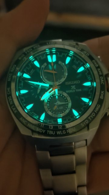 我又來賣收藏了!SEIKO超級夜光耀動閃亮,一支原價22000,目前賣3折左右,老婆說, 有進有出,新陳代謝,有益身心~ 【目的】出售 【商品】Seiko Prospex 世界城市太陽能計時錶 【型號】SSC487P1 【狀況】盒裝完整、空白保卡、說明書 【購買日期】2020/7 【售價】7,460元(訂價22,000) 【錶徑】44.6mm 【聯繫方式】站內信 【狀況】藍寶石鏡面無傷,使用新型的V195太陽能機芯,不鏽鋼錶帶,龍頭護橋部分有做 特殊紋路設計,重點這支錶的夜光是小弟手上一等一的明亮,原價22,000,momo售價1760 0,直接去掉萬元,也不用7,500元,Prospex 系列賣原價的3折多,旋轉拍賣有一支二手 賣11,000,所以,已經很便宜囉! https://i.imgur.com/Puyl7go.jpg