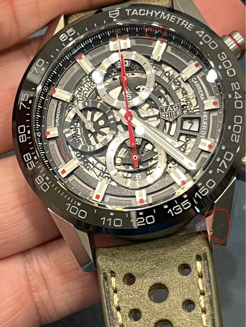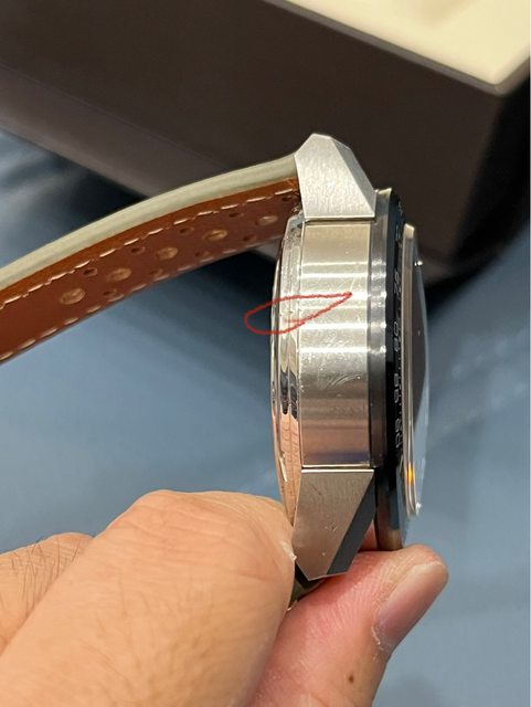傷,右下錶耳有一個較深扣傷, 圖五左側也有扣傷,陶瓷圈無傷