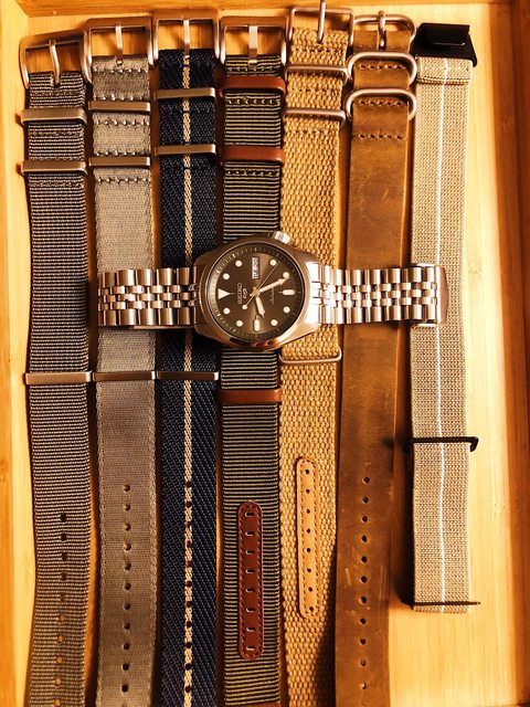 隨附物件:盒單全、原廠鋼帶、太空人五珠鋼帶(已換上)、代用nato*6、傘兵錶帶*1如圖