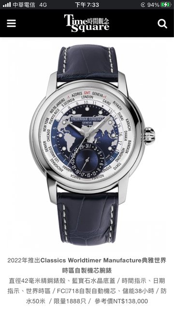 直徑42毫米精鋼錶殼、藍寶石水晶底蓋/時間指示、日期指示、世界時區/FC