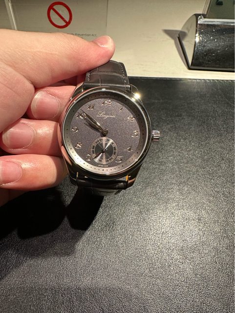噴砂面盤很好看,搭配粉色柳葉針(個人覺得看起來偏金),搭配著草寫的Longines英文