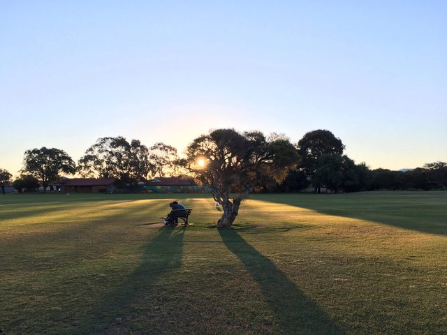 過樹蔭照耀在草地與長椅上的人們,兩個人依偎著