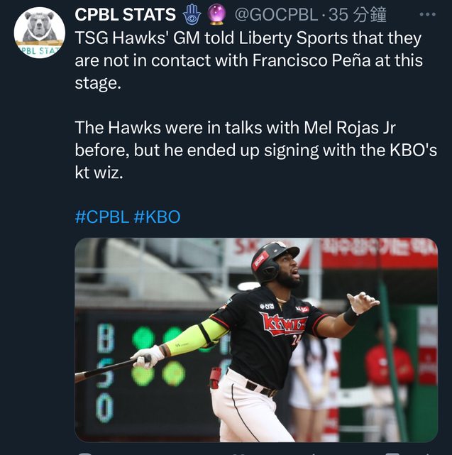 台鋼本來在談的是 Mel Rojas Jr ,但他最後決定和韓職KT巫師隊簽約