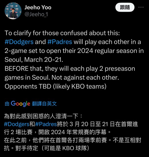 教士和道奇兩隊會在南韓開幕戰之前個別打兩場熱身賽