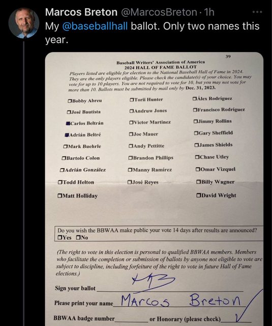 : 擁有名人堂投票資格的記者Marcos Breton公開了自己今年自己的投票