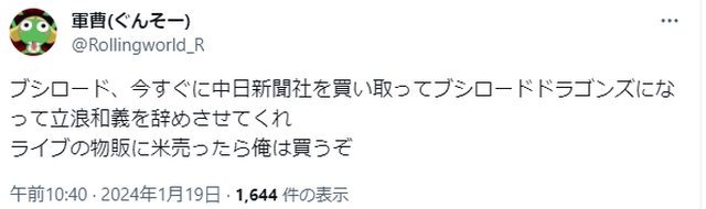「武士道快把中日新聞社買下來並改名叫武士道龍,然後請立浪辭職。如果LIVE的商品