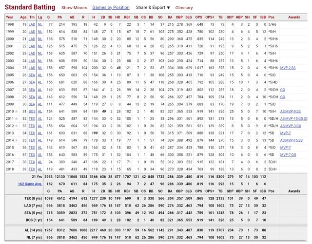 較不利的西雅圖水手主場也只有平均水準的成績,但30歲後他轉戰波士頓紅襪與德州遊騎兵
