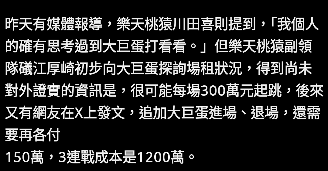 → duo05182: 結果鄉民去信沒排大巨蛋的樂天說場租300萬 01/25 13:58