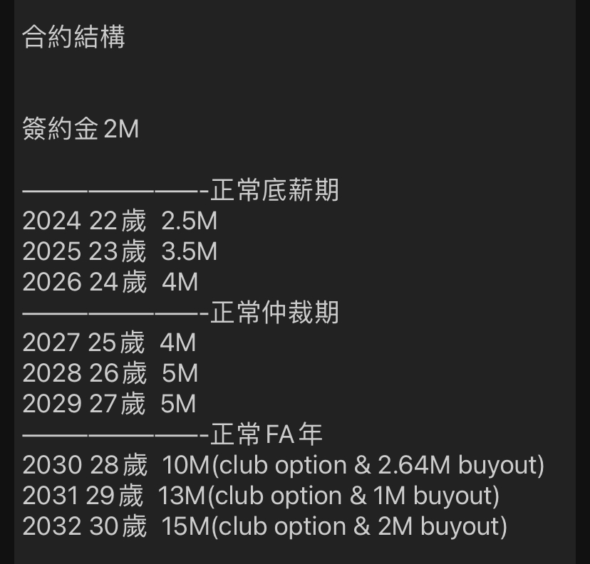 約,另外附帶2030-32年的三個球隊選擇權。因此合約年限最長可以來到9年。
