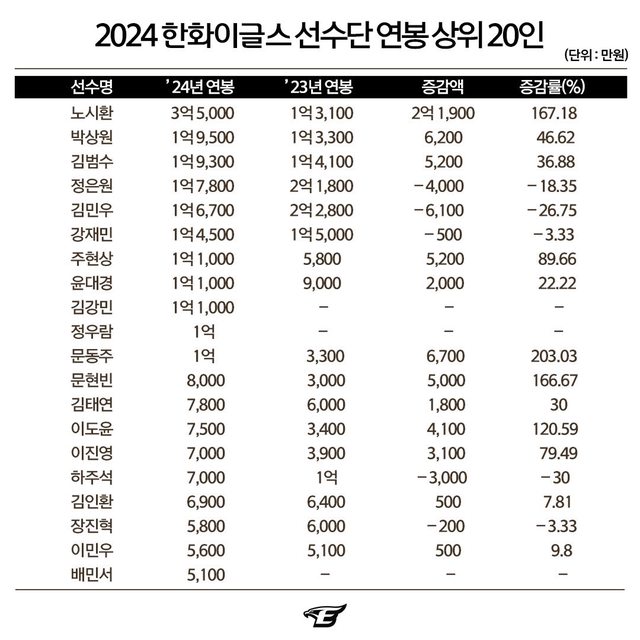 韓華老鷹公佈了2024賽季的談薪結果