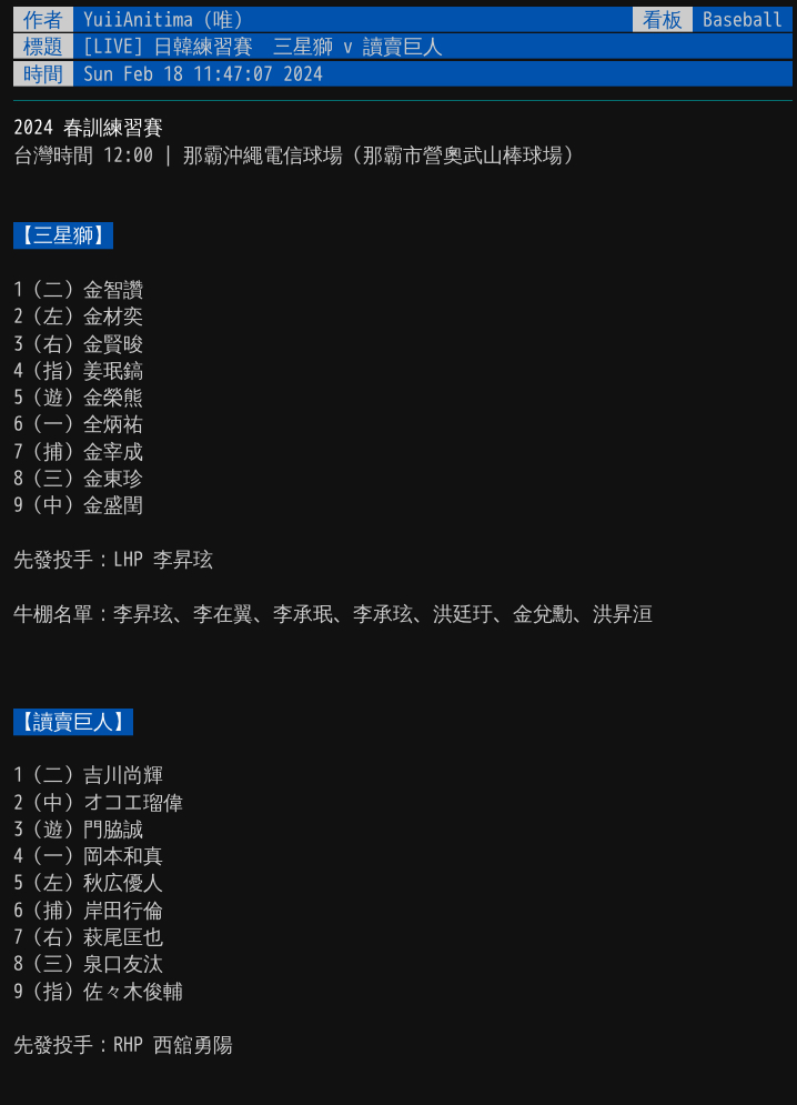推 Kaberman569: 巨人幾乎每年春訓都有和韓職交手,三星 起亞 SK... 03/05 08:26