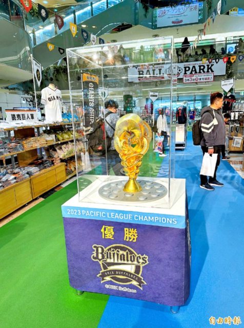 宮崎機場內設有超大型職棒春訓販賣部,同時展示歐力士2023年洋聯冠軍盃。(記者龔乃