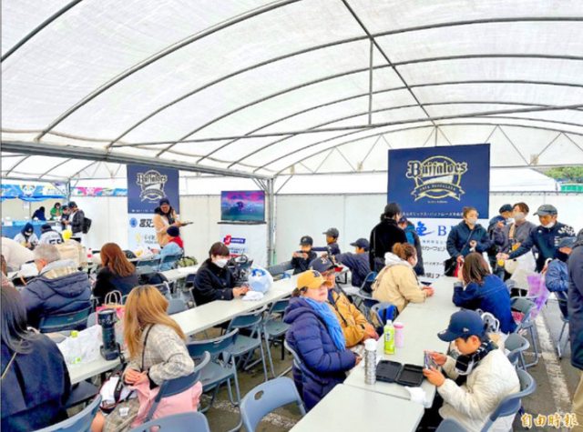 歐力士春訓基地球迷用餐區同步轉播練習賽。(記者龔乃玠攝)
