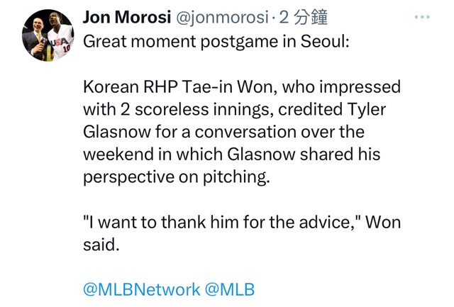 推 Mingoeet: 元兌仁看Glasnow 的表情也太好笑 03/18 01:22
