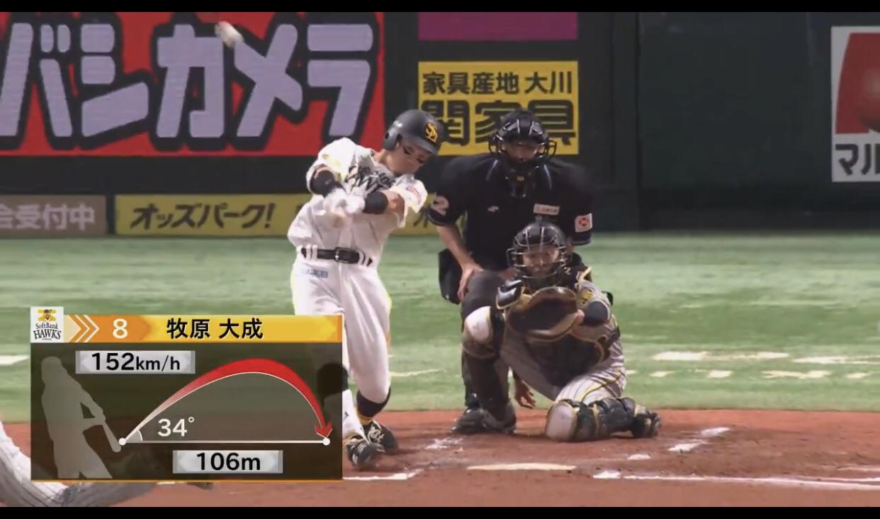 炸裂文也來熱身一下 2分砲炸村上 頌樹的切球 有點失投 EV 152km/hr LA 34度 飛行距離 106m --