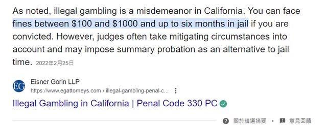 : 非法賭博在加州是一項輕罪,如果被判有罪,可能面臨100美元至1000美元的罰款,最