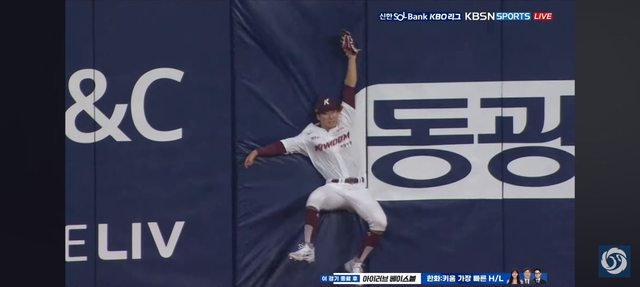 英雄中外野手李主形一路往後追,最後在全壘打牆前跳起,雖然撞上全壘打牆,不過還是