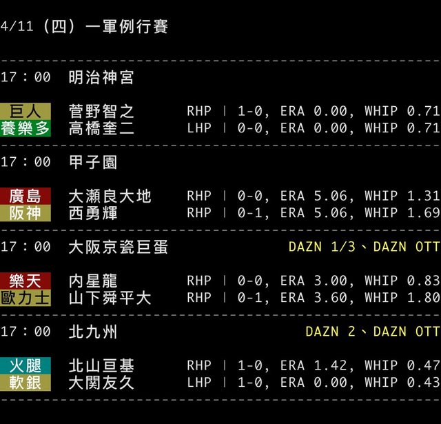 標題[情報] NPB 4/11 預告先發