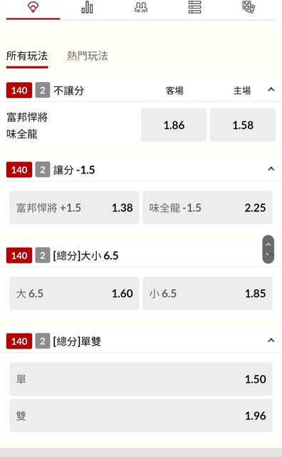 86、味全龍賠率1.58、讓分賠率開出味全龍讓1.5分賠率2.25,富邦悍將受讓1.5分,賠率1.