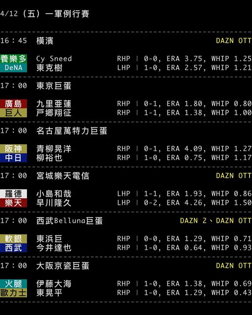 標題[情報] NPB 4/12 預告先發