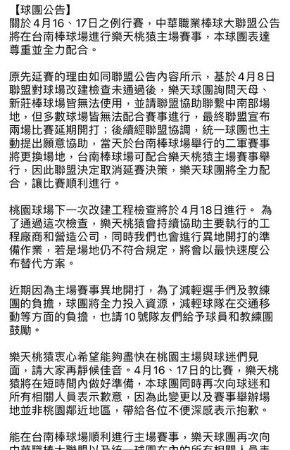 → damen0808: 球場問題不就早推給市府或聯盟了嗎,他們是”盡力配合 04/13 08:53