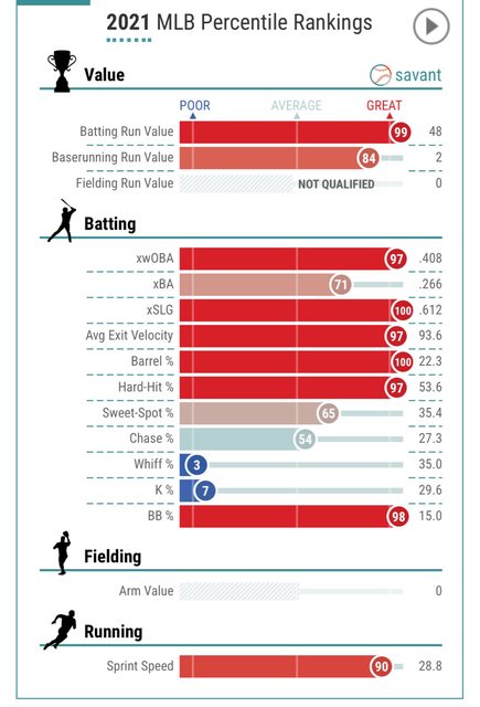 目前球是打得蠻強勁的 平均擊球初速 & 強勁擊球比例都算聯盟前段 但就是仰角廢到笑 所以跟仰角相關的出色擊球比例(Barrels%)、甜蜜點比例(sweet-spot %)都超爛 https://reurl.cc/ZenMMM 跟「甜蜜點」類似,出色擊球(Barrel)是大聯盟官方在Statcast系統啟用後所發明的新數 據項目,明確定義為「以擊球仰角和初速等條件來看,安打率不低於.500且長打率至少在1. 500之上」的擊球,其所代表的意義是:打得非常紮實、擊球仰角和初速都在優良範圍的擊 球事件。 https://reurl.cc/kO5vox 隨著正式定義出現,相關數據跟著產生,而最有實際用處的莫過於「甜蜜點比例」(SwSp% )。顧名思義,甜蜜點比例就是打者的擊球事件中,仰角落在甜蜜點(八度和32度之間)的 擊球所佔的比例。 所以一堆強勁滾地自動出局 = = 本壘板紀律 https://i.imgur.com/1d3uMMv.jpg