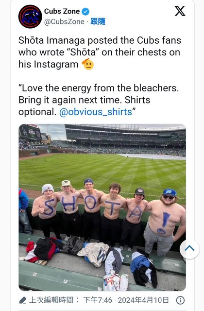 寫著「SHOTA!」6個字支持今永,而今永表示,「我有聽說他們的事,說是因為我都穿短袖
