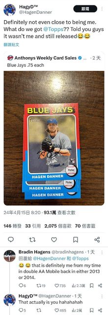 藍鳥隊新人投手Hagen Danner在X(原推特)分享他的球員卡