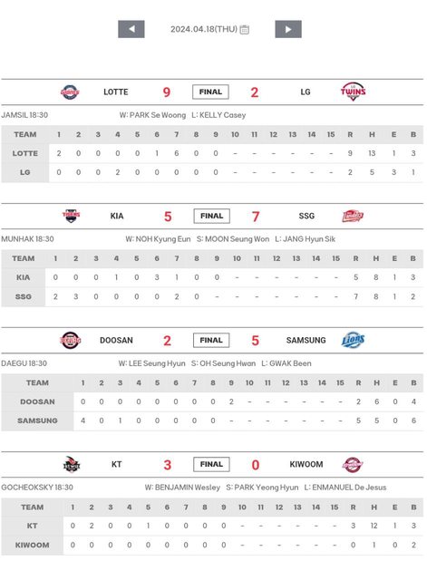 勝:盧景銀(SSG)(1勝)—2局,2H,2K,1BB,1R(1ER)(26球)