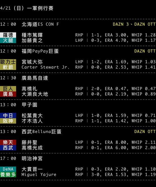 標題[情報] NPB 4/21 預告先發