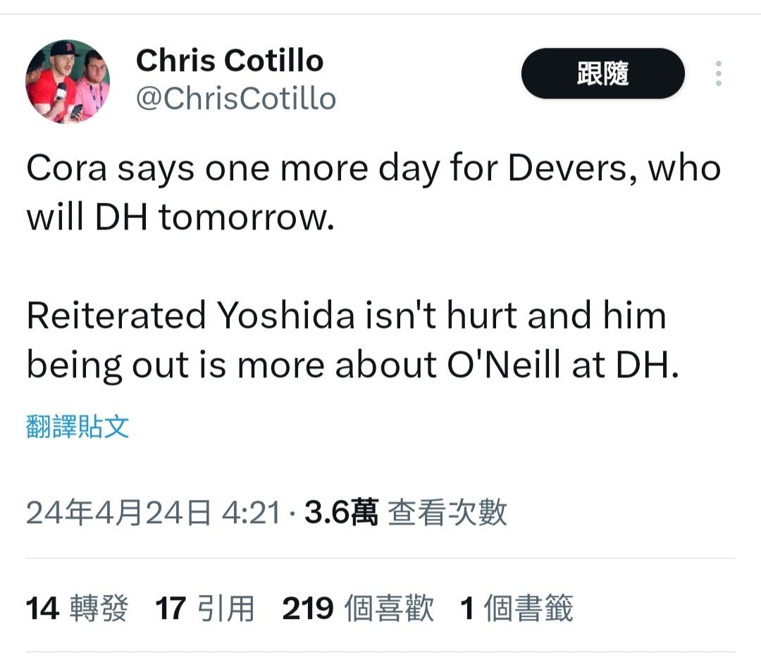 推 polanco: 吉田真慘 對右投還沒先發 04/24 08:56