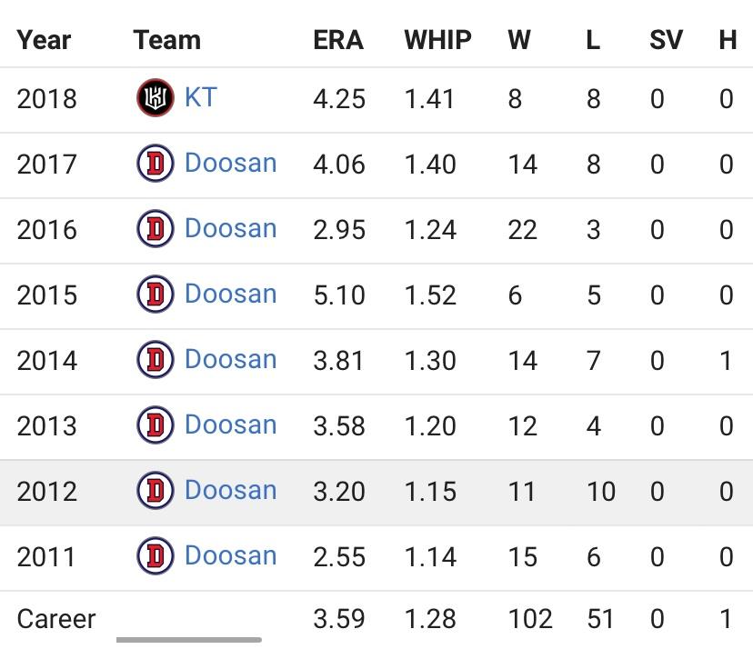 2011年加入斗山熊隊,在韓職投了8年達成了百勝紀錄
