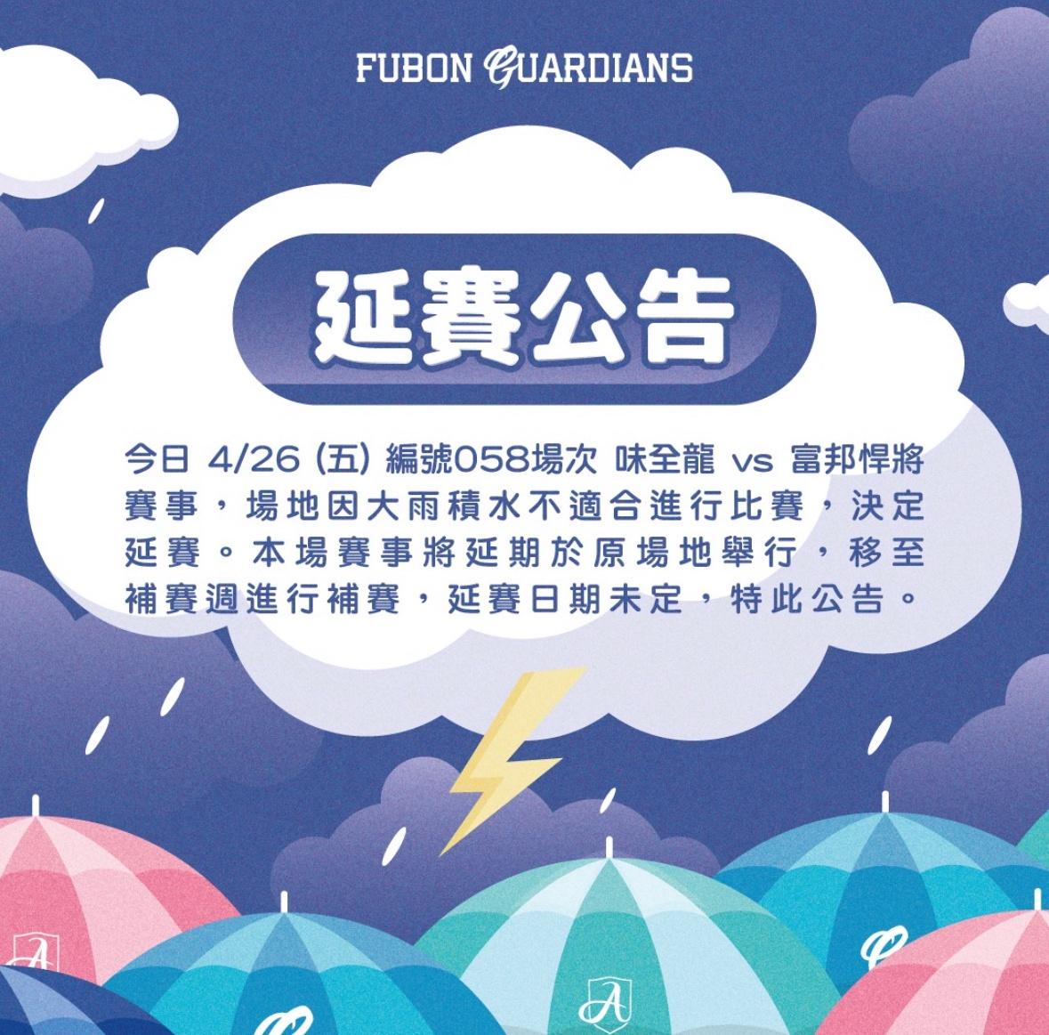 推 SoloHomerun: 新莊也宣布延賽了,唯一一場台中的要看下午的天氣 04/26 14:17
