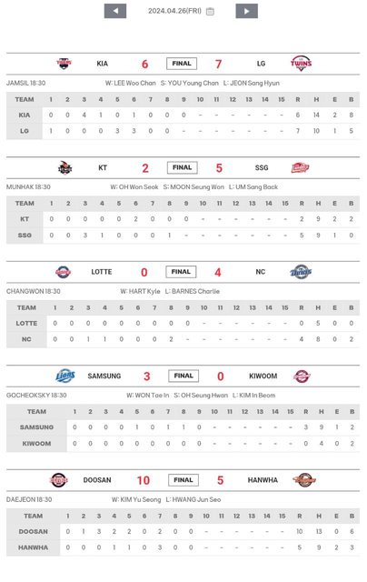 勝:元兌仁(三星)(4勝)—7局,2H,8K,1BB,1HBP,0R(100球)