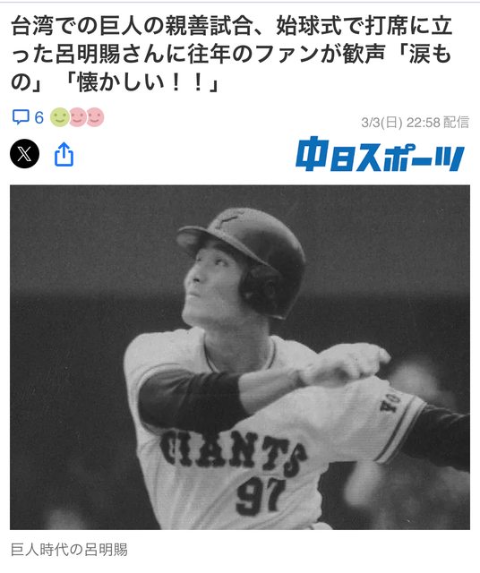 3日,在台灣台北巨蛋舉行的巨人隊與台灣樂天隊友誼賽的第一場比賽中,曾於1988年至1991年效力於巨人隊的台灣擊球手呂明賜(59歲)站在擊球手上直播了轉播。圍觀的巨人球迷爆發出一陣歡呼聲。