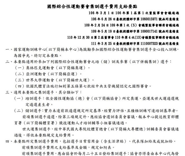 選手的「待遇」,是依照「國際綜合性運動賽會集訓選手費用支給要點」,由「國家訓練
