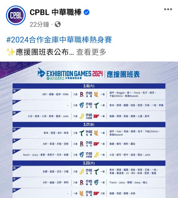 標題[討論] CPBL官方粉專:熱身賽應援團班表